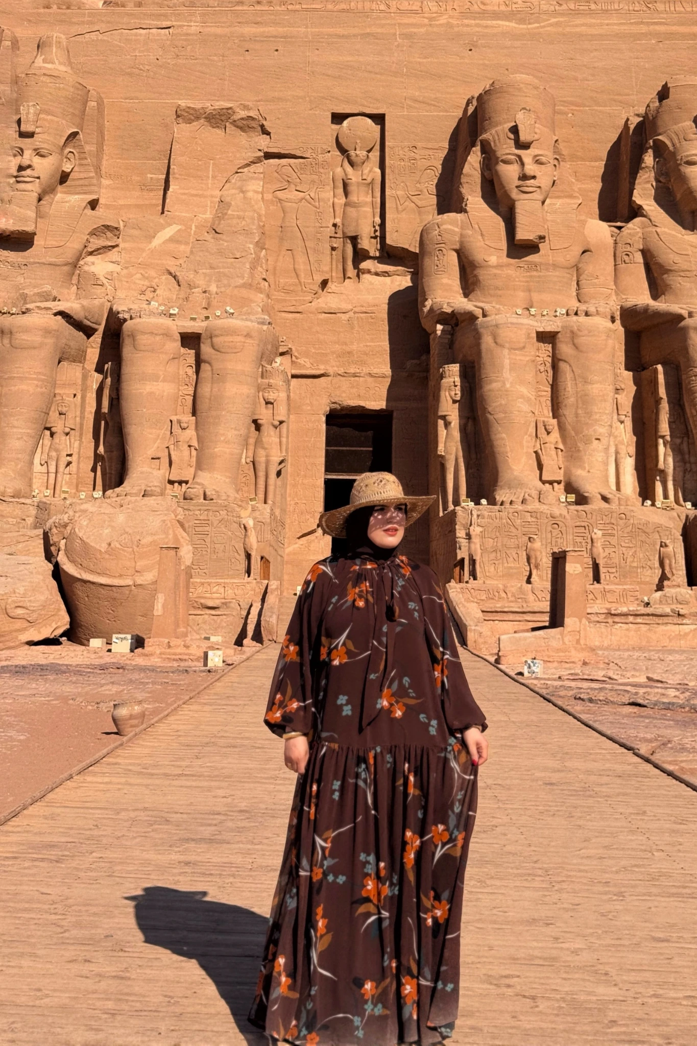 Un modèle intemporel, photographié au cœur du temple d’Abou Simbel — un hommage à la puissance féminine à travers les âges.
