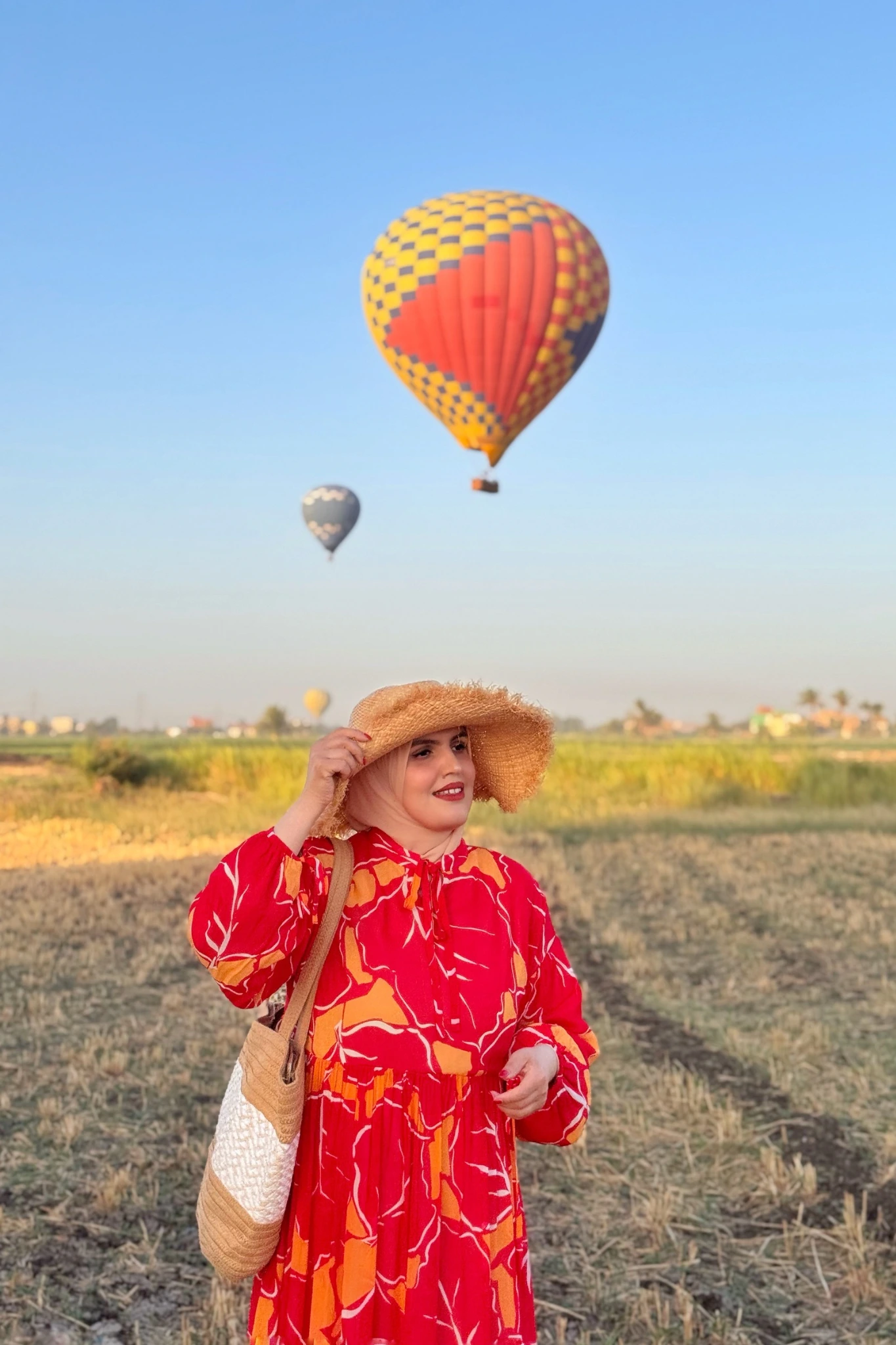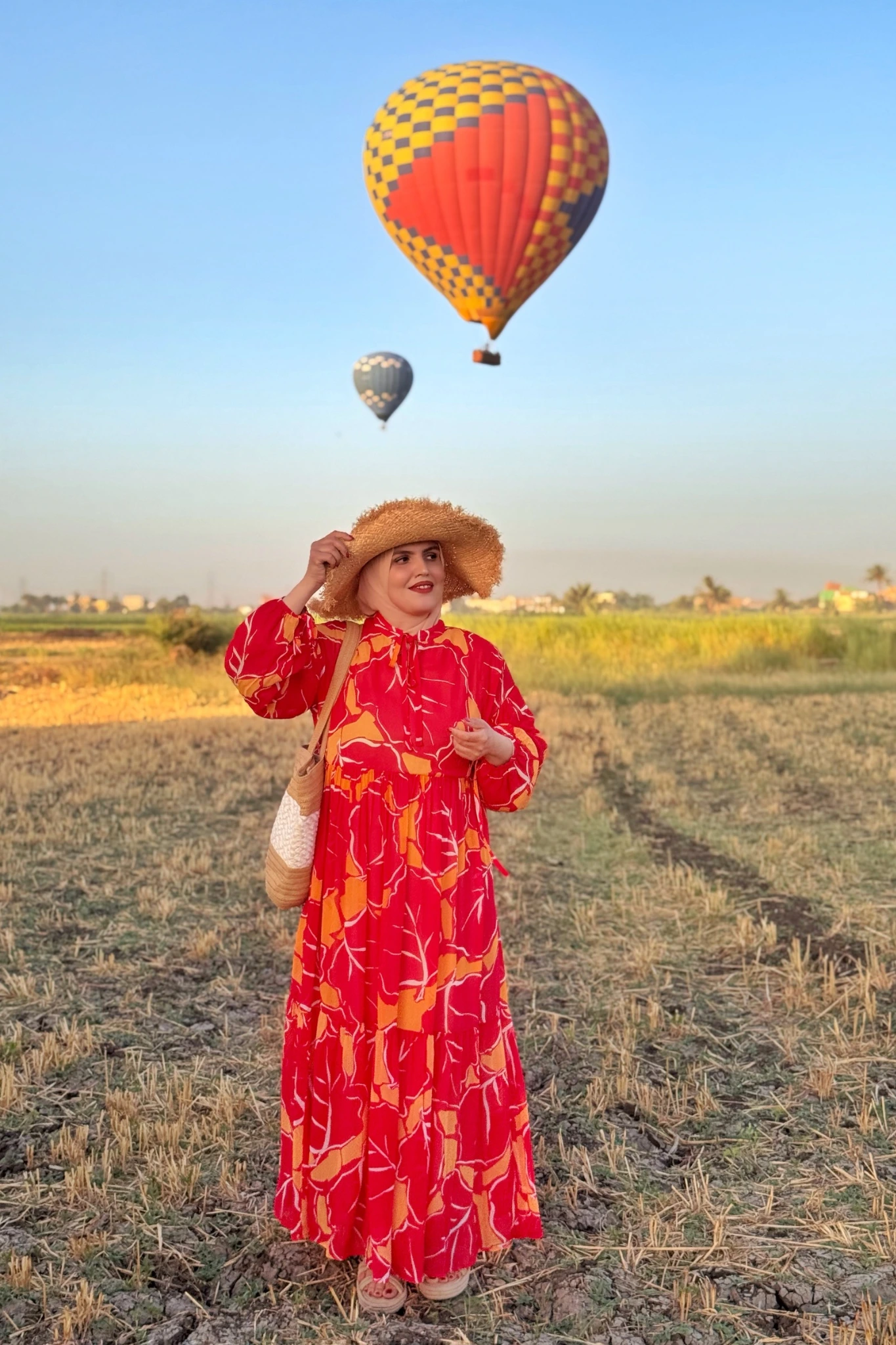 Robe longue fluide aux teintes chaudes, inspirée des couleurs vibrantes des montgolfières de Louxor.