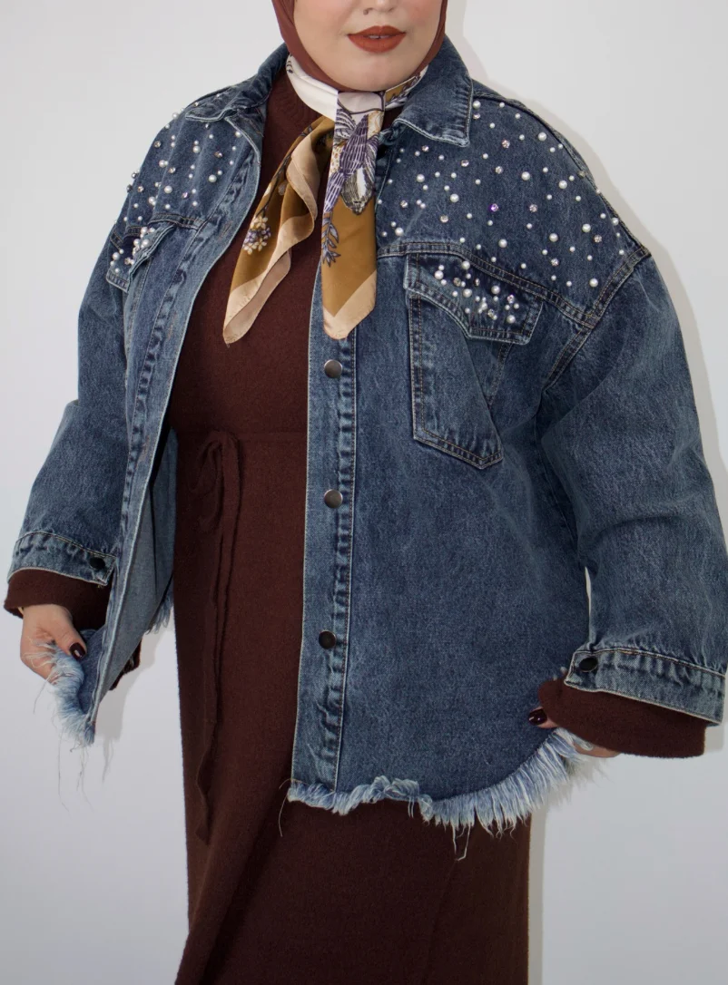 La Veste Denim Perles réinvente le classique du jean avec une touche d’éclat.